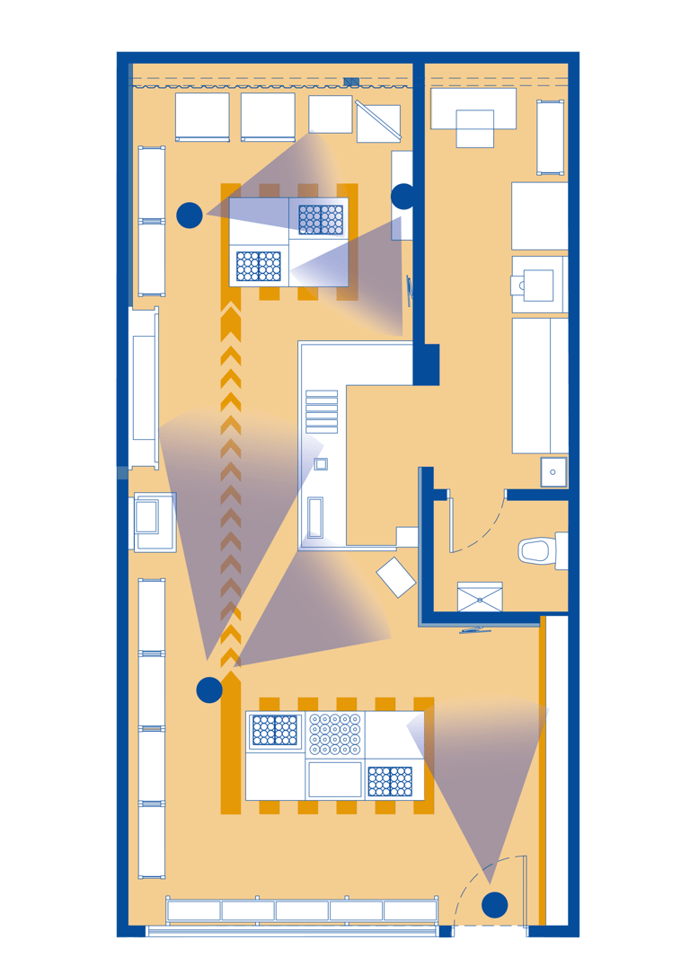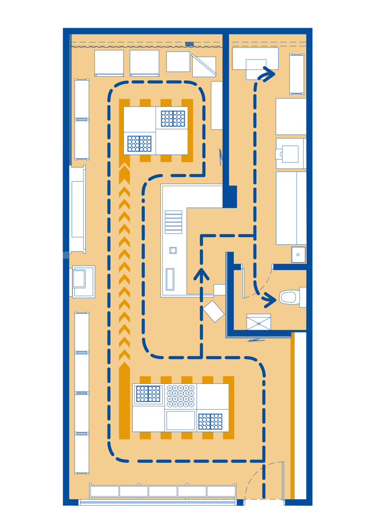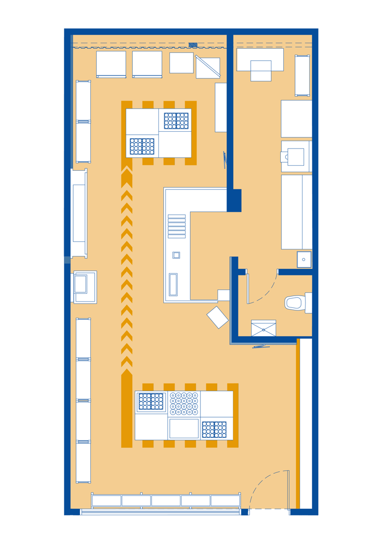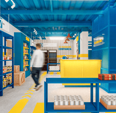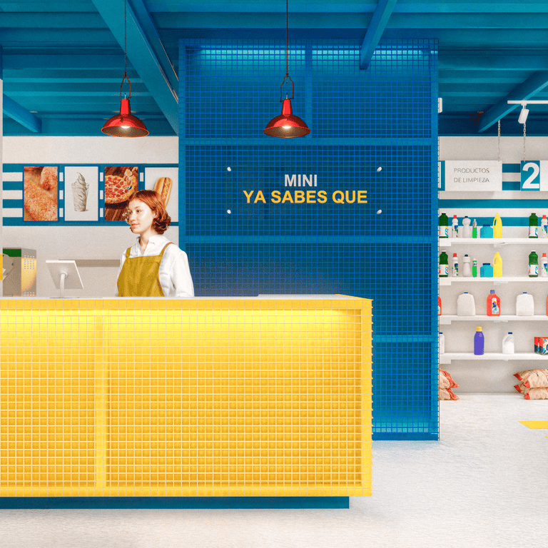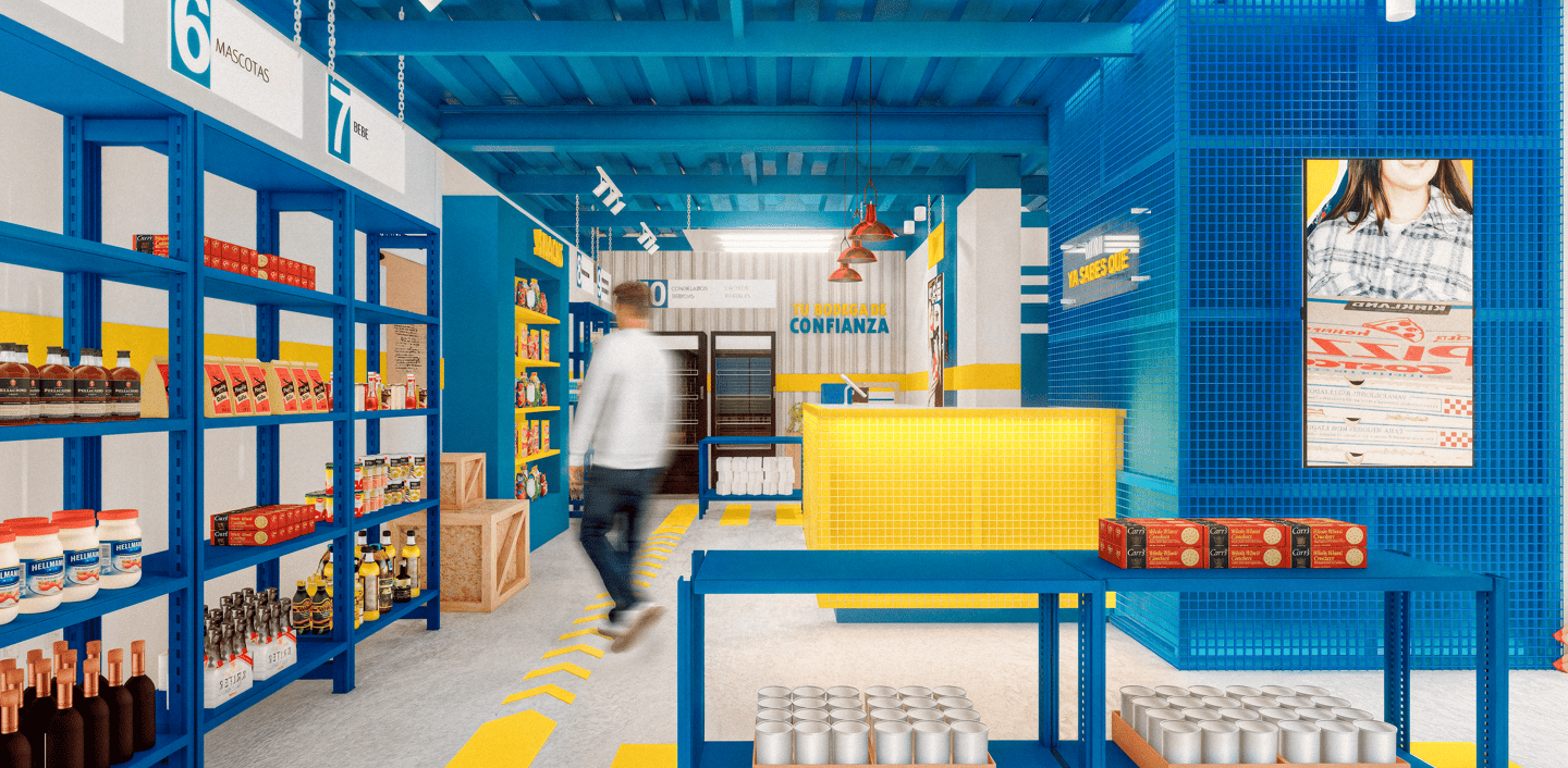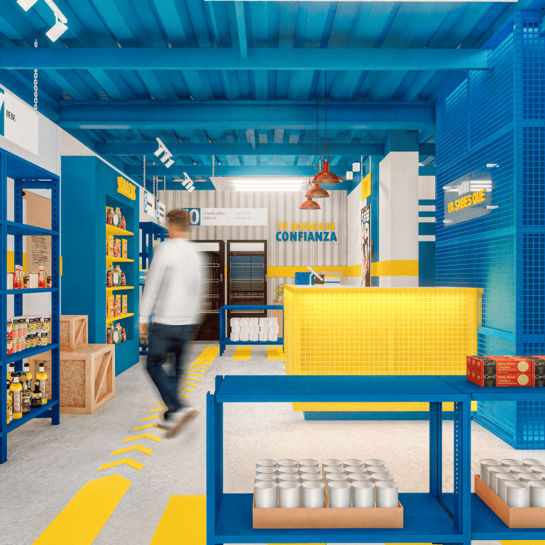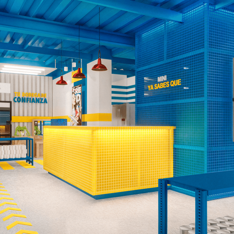 MNYSQ busca accesibilidad y claridad en su recorrido. El diseño propone un espacio lineal, sencillo y fácil de transitar, maximizando la visibilidad de los productos para incentivar la compra. El ambiente retoma la estética industrial de una bodega, con tonos azules y amarillos, y materiales robustos como el concreto y el acero.